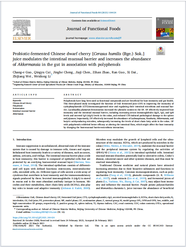 <div><br /> 【引用產(chǎn)品】:<span style="font-size: medium;"><strong><a href="http://m.qabado.com/goods-37601.html"><span style="color: rgb(51, 153, 102);"><u>Mouse IgG ELISA Kit</u></span></a></strong></span></div> <div>&nbsp;</div> <div>【產(chǎn)品貨號】:ml037601</div> <div>&nbsp;</div> <div>【論文標題】:Probiotic-fermented Chinese dwarf cherry [Cerasus humilis (Bge.) Sok.] juice modulates the intestinal mucosal barrier and increases the abundance of Akkermansia in the gut in association with polyphenols</div> <div>&nbsp;</div> <div>【論文網(wǎng)址】:<span style="color: rgb(255, 0, 0);"><strong><a href="https://www.sciencedirect.com/science/article/pii/S1756464621000736"><span style="color: rgb(255, 0, 0);"><u>https://www.sciencedirect.com/science/article/pii/S1756464621000736</u></span></a></strong></span></div> <div>&nbsp;</div> <div>【影響因子】:4.451</div> <div>&nbsp;</div> <div>【反應物種】:Mouse</div> <div>&nbsp;</div> <div>【第一作者】:Chang-e Guo</div> <div>&nbsp;</div> <div>【通信作者】:Weidong Li</div> <div>&nbsp;</div> <div>【發(fā)表時間】:2021-03-23</div> <div>&nbsp;</div> <div>【期 刊】:Journal of Functional Foods</div> <div>&nbsp;</div> <div>【單 位】:北京中醫(yī)藥大學中藥學院</div> <div>&nbsp;</div> <div>【實 驗】:ELISA</div> <div>&nbsp;</div> <div>【組 織】:serum</div> <div>&nbsp;</div> <div>【DOI】:10.1016/j.jff.2021.104424<br /> &nbsp;</div> <div><img src="/images/upload/Image/圖片1(6481).png" alt="" /></div>