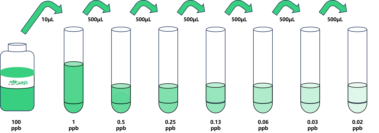 試劑盒中取出標(biāo)準(zhǔn)品,準(zhǔn)備7個(gè)試管,先將100ppb標(biāo)準(zhǔn)品(200µL)按需吸取一定量用1×稀釋液稀釋至1ppb(例:10µL的標(biāo)準(zhǔn)品母液+990µL的1×稀釋液,制備得到1000μL的1ppb濃度標(biāo)準(zhǔn)品),隨后在6個(gè)試管中分別加入500μL的1×稀釋液,在這6個(gè)單獨(dú)的試管中將1ppb標(biāo)準(zhǔn)品依次2倍倍比稀釋至7個(gè)梯度,共配制7個(gè)濃度的標(biāo)準(zhǔn)品,依次為:1ppb、0.5ppb、0.25ppb、0.125ppb、0.06ppb、0.03ppb、0.015ppb,從最高濃度標(biāo)準(zhǔn)品溶液中吸取500μL標(biāo)準(zhǔn)品到下一個(gè)試管中,輕輕吹打混勻,以此類推進(jìn)行標(biāo)準(zhǔn)品的倍比稀釋(如圖所示),1×稀釋液用作零濃度標(biāo)準(zhǔn)品(0ppb)。