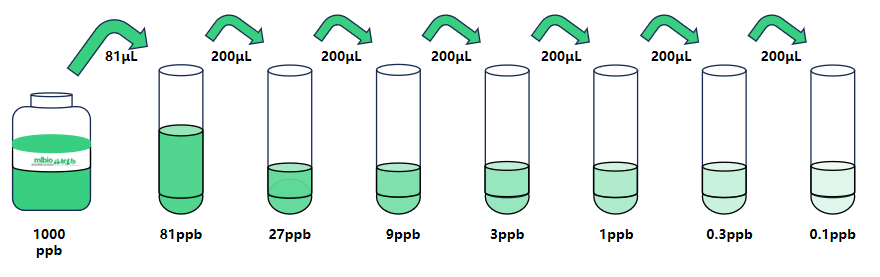 試劑盒中取出標(biāo)準(zhǔn)品,準(zhǔn)備7個(gè)試管,先將1000ppb標(biāo)準(zhǔn)品(200µL)按需吸取一定量用1×稀釋液稀釋至81ppb(例:81µL的標(biāo)準(zhǔn)品母液+919µL的1×稀釋液,制備得到1000μL的81ppb濃度標(biāo)準(zhǔn)品),隨后在6個(gè)試管中分別加入400μL的1×稀釋液,在這6個(gè)單獨(dú)的試管中將81ppb標(biāo)準(zhǔn)品依次3倍倍比稀釋至7個(gè)梯度,共配制7個(gè)濃度的標(biāo)準(zhǔn)品,依次為:81ppb、27ppb、9ppb、3ppb、1ppb、0.3ppb、0.1ppb,從最高濃度標(biāo)準(zhǔn)品溶液中吸取200μL標(biāo)準(zhǔn)品到下一個(gè)試管中,輕輕吹打混勻,以此類(lèi)推進(jìn)行標(biāo)準(zhǔn)品的倍比稀釋?zhuān)ㄈ鐖D所示),1×稀釋液用作零濃度標(biāo)準(zhǔn)品(0ppb)。