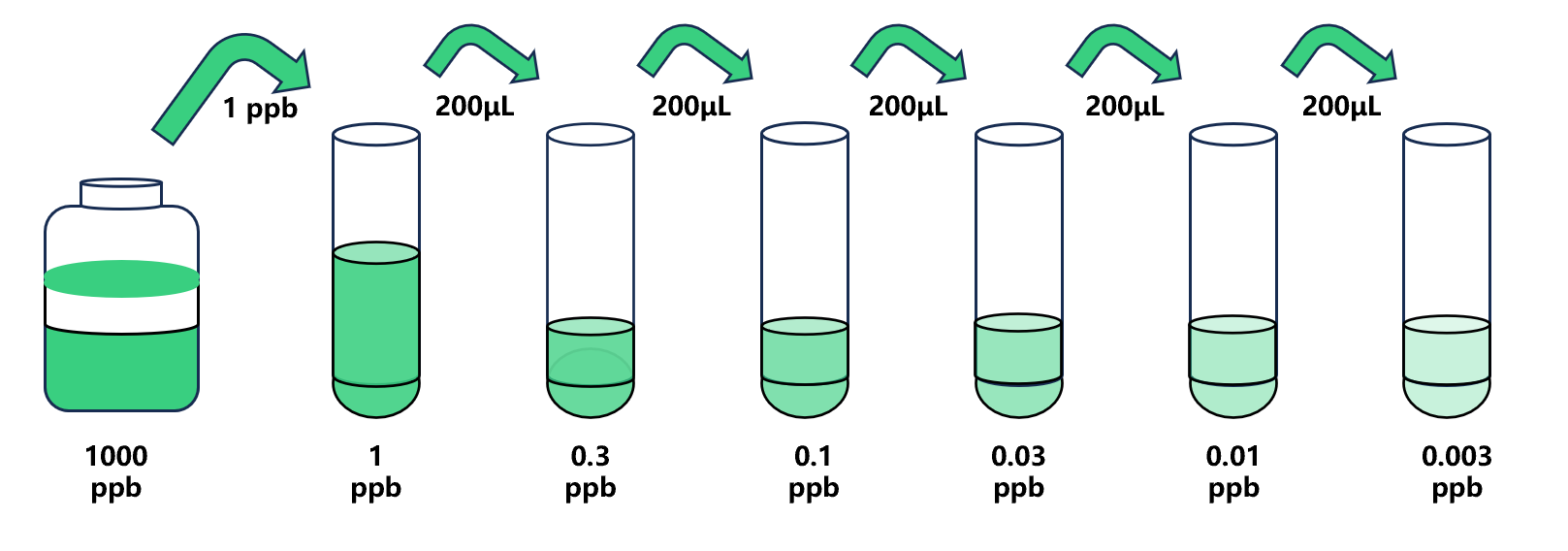 試劑盒中取出標(biāo)準(zhǔn)品,準(zhǔn)備7個(gè)試管,先將1000ppb標(biāo)準(zhǔn)品(200µL)按需吸取一定量用1×稀釋液稀釋至1ppb(例:1µL的標(biāo)準(zhǔn)品母液+999µL的1×稀釋液,制備得到1000μL的1ppb濃度標(biāo)準(zhǔn)品),隨后在5個(gè)試管中分別加入400μL的1×稀釋液,在這6個(gè)單獨(dú)的試管中將1ppb標(biāo)準(zhǔn)品依次3倍倍比稀釋至5個(gè)梯度,共配制5個(gè)濃度的標(biāo)準(zhǔn)品,依次為:1ppb、0.3ppb、0.1ppb、0.03ppb、0.01ppb、0.003ppb,從最高濃度標(biāo)準(zhǔn)品溶液中吸取200μL標(biāo)準(zhǔn)品到下一個(gè)試管中,輕輕吹打混勻,以此類推進(jìn)行標(biāo)準(zhǔn)品的倍比稀釋(如圖所示),1×稀釋液用作零濃度標(biāo)準(zhǔn)品(0ppb)。