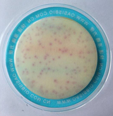 紫紅色的菌落為金黃色葡萄球菌;呈藍(lán)色的菌落為其他雜菌。選擇菌落數(shù)適中(20~200CFU)的檢測(cè)板進(jìn)行計(jì)數(shù),乘以稀釋倍數(shù)后即為每毫升(克)樣品中所含的金黃色葡萄球菌數(shù)目。